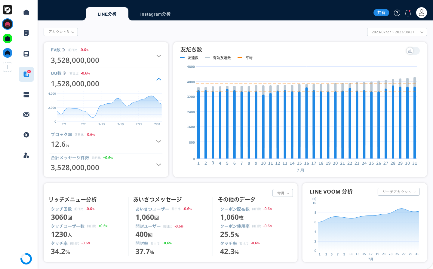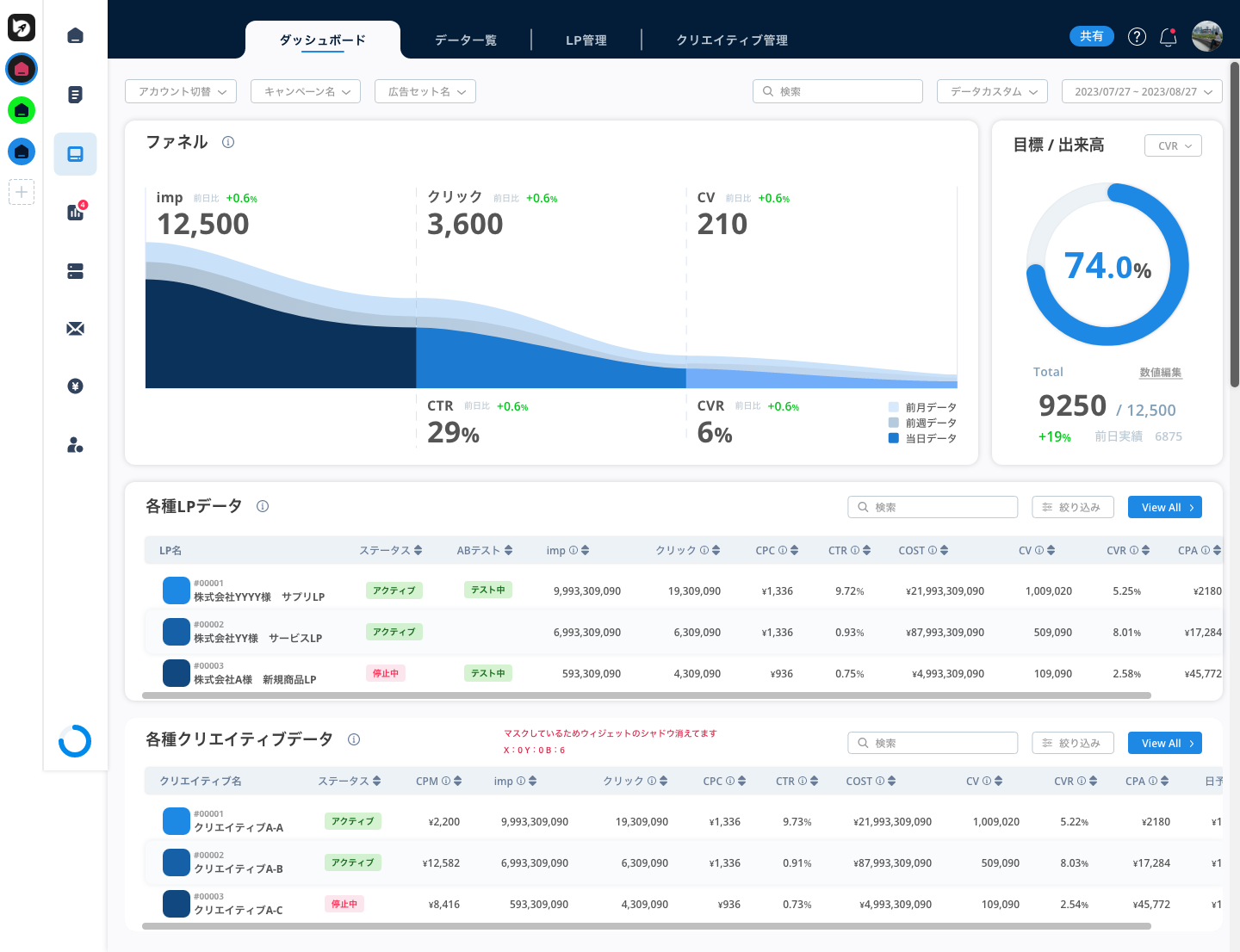 Click Boosterには、高度なアナリティクス機能がありダッシュボードから直感的にデータを収集することができます。広告代理店ユーザーは、子アカウントを発行してクライアントに渡すだけでOK!日報、週報は必要ありません。