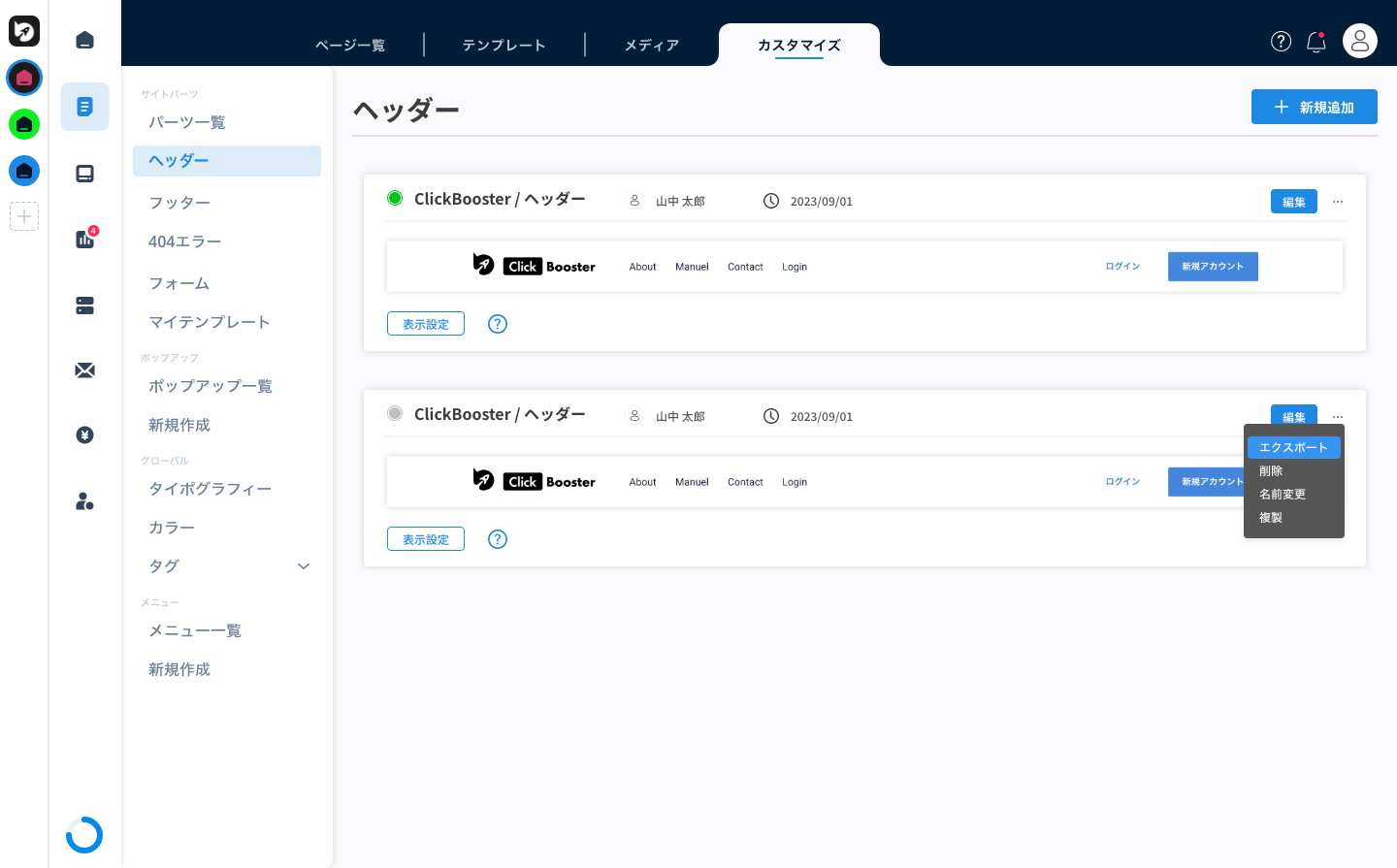 任意のページで『ヘッダー・フッター』などを使い回すことのできる『サイトパーツ機能』を備えています。これにより、1ページごとに『ヘッダーフッター』を生成する必要がなくなり、スピード制作することが可能です。