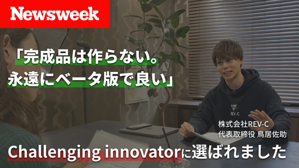 株式会社REV-C 代表取締役社長:鳥居 佐助(以下 REV-C , 鳥居)がNewsweekが独自審査により選出するchallenginginnovatorに選ばれました。 本取材では、REV-Cがどのような取り組みを行っているのか、その独自のビジネスモデルや考え方、今後の展望について取り上げていただきましたのでご報告します。 NewsWeekとは New […]